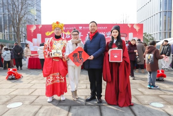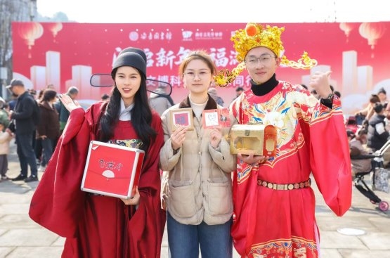 在科技的炫酷之外,传统年俗是新春的底色,传统技艺传递着新年的温度。活动现场,非遗传承人以吴昌硕梅花图为底,将梅香与春意拓印纸上,送出幸福美满的祝福;书法家泼墨挥毫,送出潇洒写意的新年态度;“财神”和“状元郎”NPC与群众互动,通过诗词对答送好礼等互动体验,送出富足安康的祝愿。各类体验活动人气爆棚,在人与人的质朴交流间,传递新春的喜悦。